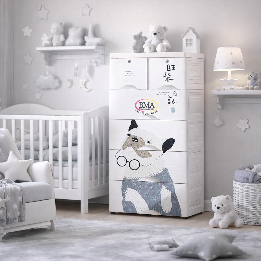C’est une armoire de rangement en plastique pour bébés et enfants, avec un motif de chien de dessin animé.