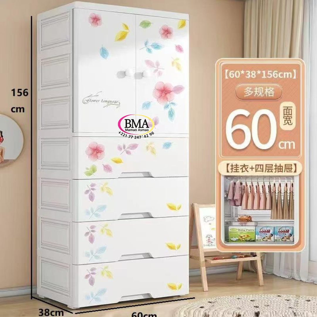 Cette armoire en plastique pour bébé & tout-petit avec motif floral est un meuble de rangement polyvalent doté de dimensions d’environ 60 x 38 x 156 cm. Elle est caractérisée par deux portes supérieures et quatre tiroirs en dessous, offrant une solution de rangement combinée pour suspendre les vêtements et organiser d’autres articles.