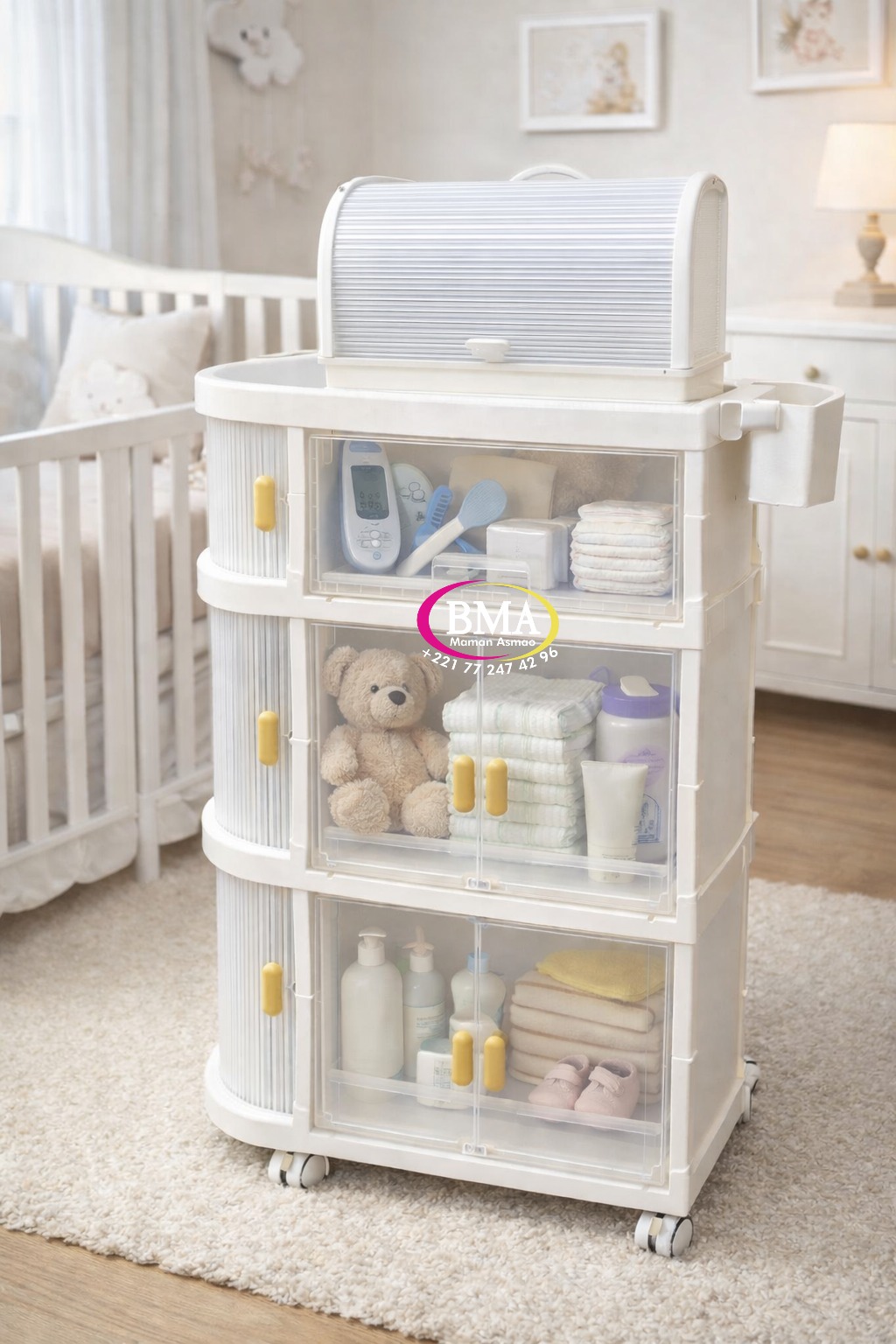 - Fonctionnalité : Conçu pour organiser les essentiels de bébé, il dispose de plusieurs niveaux de tiroirs et de compartiments de rangement clairs pour une visibilité facile du contenu. Il inclut un égouttoir à biberons sur le dessus et des compartiments latéraux pour les produits de soins.