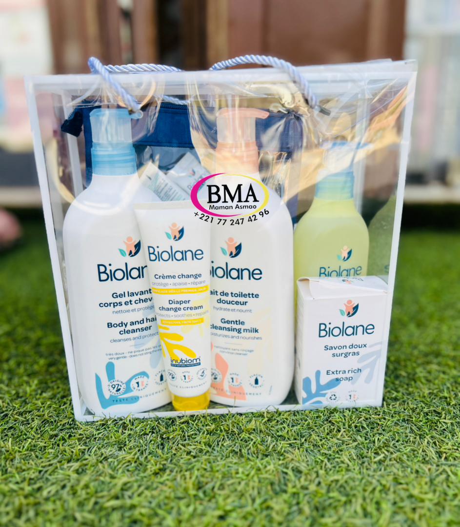Kit Biolane complet pour la toilette de bébé : gel lavant, lait de toilette, crème de change, savon surgras et eau nettoyante + trousseau de 3 petites crèmes apaisantes + bavoir . Douceur, protection et soin au quotidien !