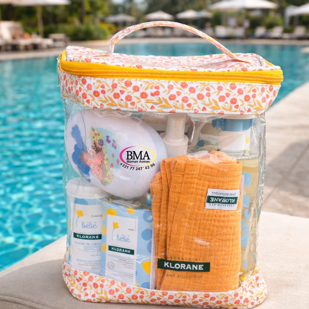 - Composition : cette trousse Klorane Bébé inclue des essentiels tels que du gel lavant doux 500ml, de l’eau nettoyante sans rinçage (micellaire) 500ml, du lait hydratant 750ml, d’eau fraiche parfumée 500ml, de la poudre de toilette protectrice 100g, du savon 250g, un éponge et lange.