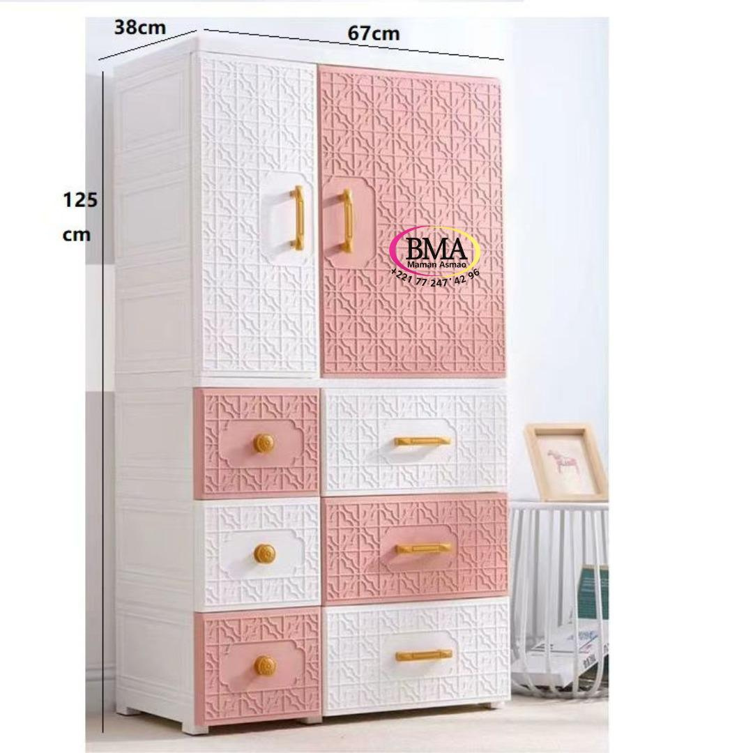 Armoire en plastique à double porte et plusieurs tiroirs de rangement.